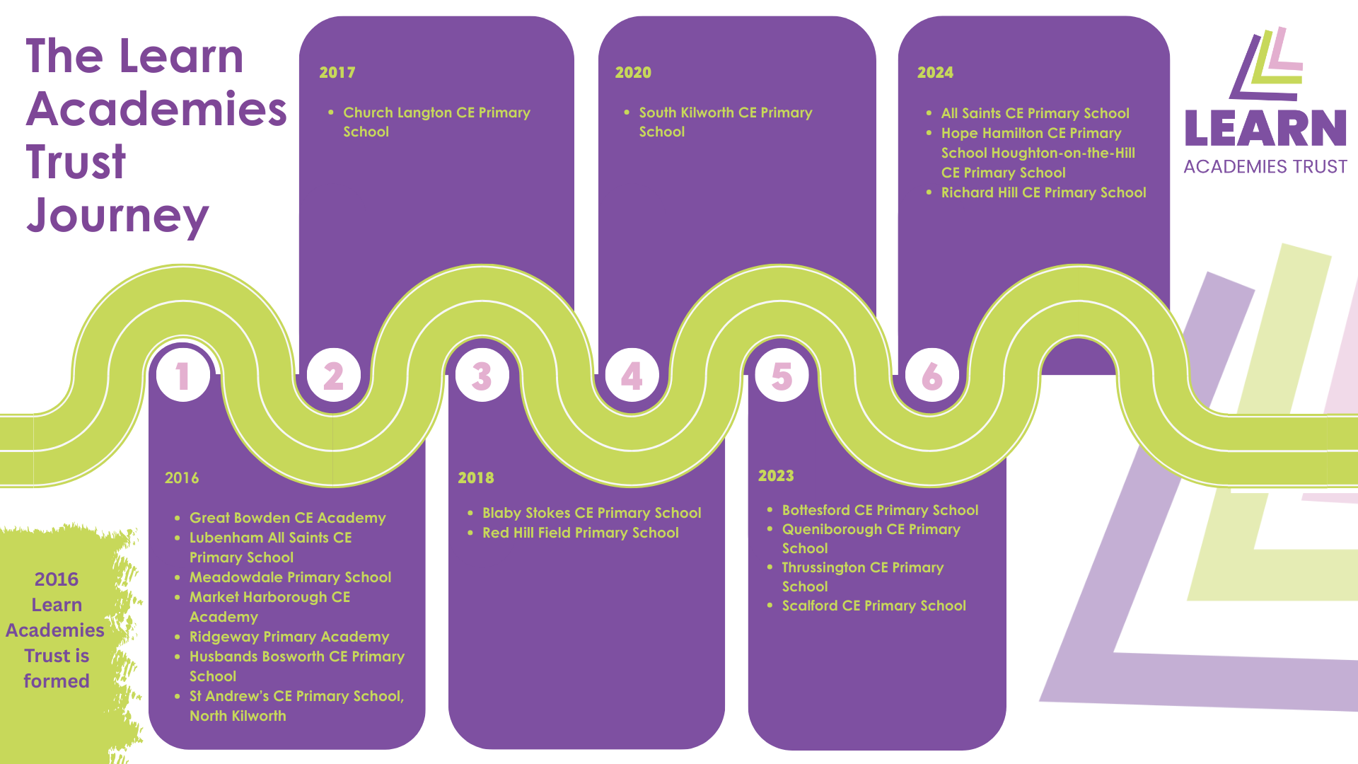 Learn Academies Trust was established in September 2016 to serve children and families in Church of England and Community schools in South Leicestershire. The organisation grew from a group of local Market Harborough primaries who had been working together in a collaborative trust since 2012. In 2016, five of those primaries: